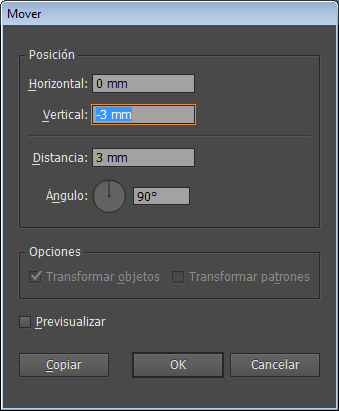 Ahora, pulsa Ctrl+M y te aparecerá el cuadro de diálogo de «Mover». En él, pones 0 en horizontal y -3 en vertical (mm los pone sólo). Ponemos -3 porque el símbolo menos desplaza hacia arriba y el + o nada hacia abajo: