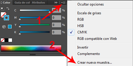 Ahora, una vez lo tengas, haces clic en el icono situado en la parte superior derecha de la paleta \»Color\» y seleccionas, en el menú, Crear nueva muestra:
