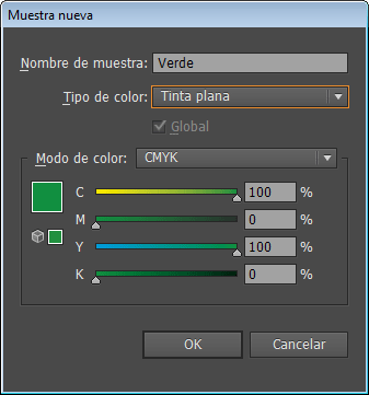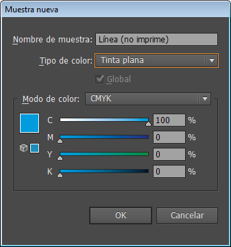 Después, modificamos el nombre del color por «Línea (no imprime)» y el tipo de color lo modificamos a «Tinta Plana». Cuando tengas esto, pulsa OK para crear el nuevo color con los atributos que hemos modificado. Como puedes ver, esto vale tanto para flexografía como para offset: