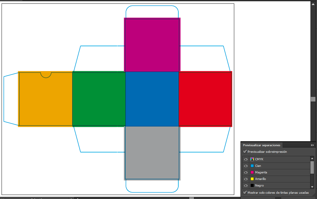 En las imprentas luego ocultan este color y no imprimen la línea. Pero sirve para ajustar los diseños en offset y que estén en perfectas condiciones. Ahora sigue quitando colores planos: Gris, rojo y verde.
