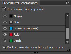 Quizá te preguntes qué hace ahí «Línea (no imprime)…» Bueno, es otra de las tintas planas que creamos al principio. Su función es la de ajuste. Oculta la línea. Ahora ves sólo los colores uno al lado del otro. De esta manera, puedes comprobar si existen huecos blancos entre ellos. Si no sobreimprimes la línea, verás todos los huecos en blanco donde debería ir la línea.