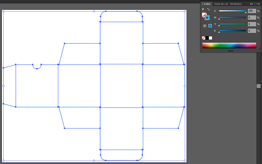 Selecciona la herramienta rectángulo (M) y haz un rectángulo que coincida con el segundo cuerpo empezando por la izquierda (el primero es la zona de pegado). Cuando lo tengas, creas un color con los atributos CMYK siguientes: